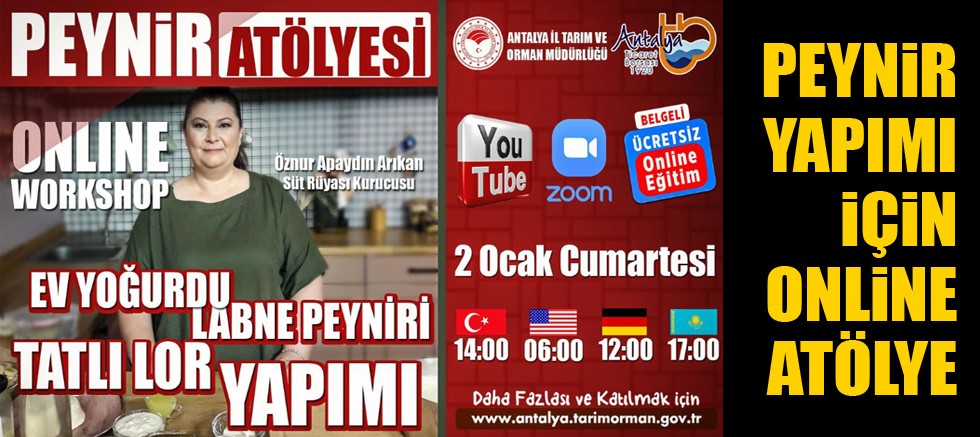 Antalya Ticaret Borsası ile Antalya Tarım ve Orman Müdürlüğü işbirliğinde pandemi döneminde tarımsal eğitimi sürdürebilmek amacıyla başlatılan uzaktan eğitim programı, Peynir Atölyesi ile devam ediyor. Ücretsiz online planlanan Peynir Atölyesi 2 -24 Ocak tarihleri arasında Cumartesi ve Pazar günleri yapılacak. Eğitimin sonunda yapılacak sınavda başarılı olan katılımcılara belge verilecek.