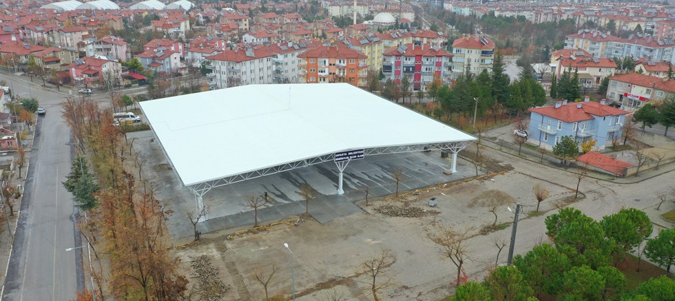Tabelası asılarak hazır hale getirilen Binbirevler Mahallesi Kapalı Pazaryeri açılış için gün sayarken, bölgede çevre düzenleme çalışmaları yapılıyor.