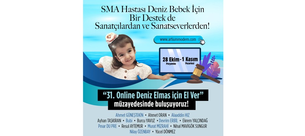Çok değerli sanatçılar ve koleksiyonerler, Spinal Müsküler Atrofi (SMA) hastası 31 aylık Deniz Elmas’a destek olmak için online bir müzayedede bir araya geliyor. Artium Modern’in ev sahipliğinde düzenlenecek online müzayedeye en seçkin eserlerini bağışlayan sanat severler, Deniz Bebek için gerekli olan tedavi masrafının karşılanması için tek yürek oluyor. 28 Ekim Perşembe günü başlayacak online müzayede 1 Kasım Pazartesi günü saat 19:00’a kadar sürecek.