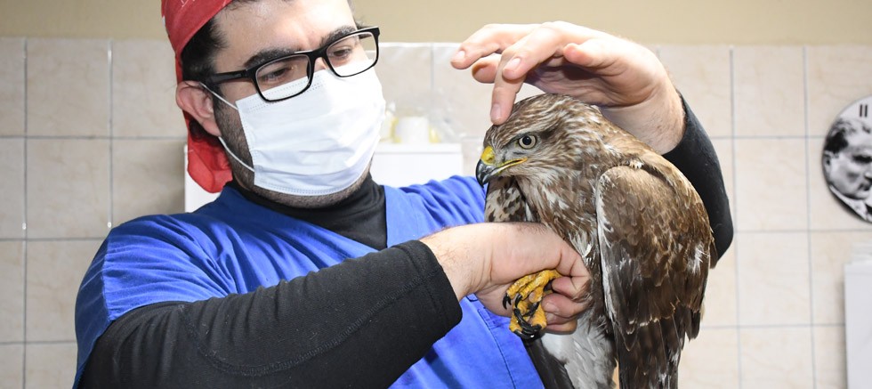 Kemer Belediyesi Veteriner Hekimi Fevzi Uzun, yaralı şahinin tedavisine başladı.