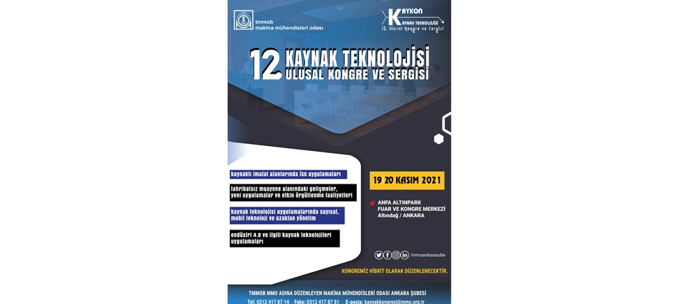 TMMOB Makina Mühendisleri Odası (MMO) Ankara Şube tarafından, 19-20 Kasım 2021 tarihleri arasında gerçekleştirilecek olan Kaynak Teknolojisi 12. Ulusal Kongre ve Sergisi’nin hazırlıkları tamamlanmak üzere…