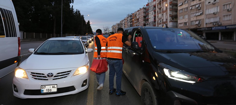 Kepez Belediyesi, Ramazan ayının manevi atmosferini paylaşmak ve iftara yetişemeyenlere destek olmak amacıyla iftar saatine dakikalar kala trafikteki vatandaşlara kumanya dağıttı.