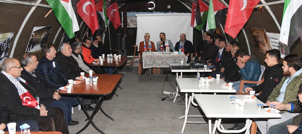 Konuşmaların ardından Filistin’de hayatını kaybedenler ile tüm şehitlerimiz için dua edildi. Belediye Başkanı Şükrü Başdeğirmen, Gazze Nöbet Çadırı önündeki Gazze anı defterini de imzaladı.