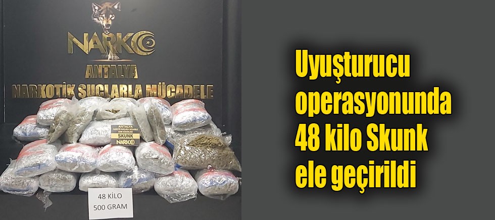 Antalya Valiliği İl Emniyet Müdürlüğünce, il genelinde uyuşturucu maddelerin kaynağının kurutulması, ticaretinin ve kullanımının engellenmesi amacıyla gerçekleştirilen başarılı operasyonlar tüm hızıyla devam ediyor. Emniyet ekipleri yaptıkları çalışmalar sonucu gerçekleştirdikleri operasyonda 48 kilo 500 gram skunk adı verilen esrar maddesi ele geçirdi.