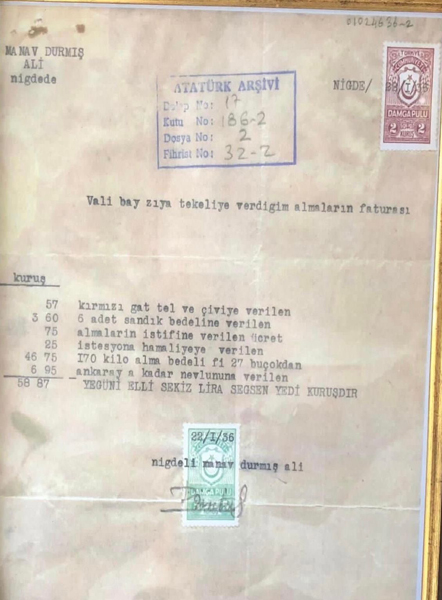 Orijinali devlet arşivinde olan ve bir örneği kendisine hediye edilen faturayı inceleyen CHP Niğde Milletvekili Ömer Fetih Gürer, “Büyük Önder Mustafa Kemal Atatürk, Niğde’den aldığı 170 kg elma karşılığında, dönemin valisine emir vererek, manavın fatura kesmesini istemiş, Niğdeli manav Durmuş Ali de ‘Vali Ziya Tekeyi’ye verdiğim elma faturası’ notunu düştüğü 58 lira 87 kuruş tutarındaki faturada tüm detayları yazmış.6 sandık elma için harcanan sandık parası, istifler için harcanan miktar, sandıkların tren istasyonuna taşınmasına karşılık hamaliye parası, Ankara7ya kadar navluna verilen para dahi tek tek not edilmiş. Burada Büyük Önder Mustafa Kemal Atatürk, 6 sandık elma için bile fatura kesilmesi talimatını vererek, büyük devlet adamlığının nasıl olduğunu da gösteriyor” dedi.
