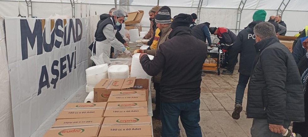 Kahramanmaraş Milli İrade Parkında kurulan MÜSİAD Aşevi ise bölgede depremden etkilenen vatandaşlara üç öğün yemek servisini sürdürüyor.