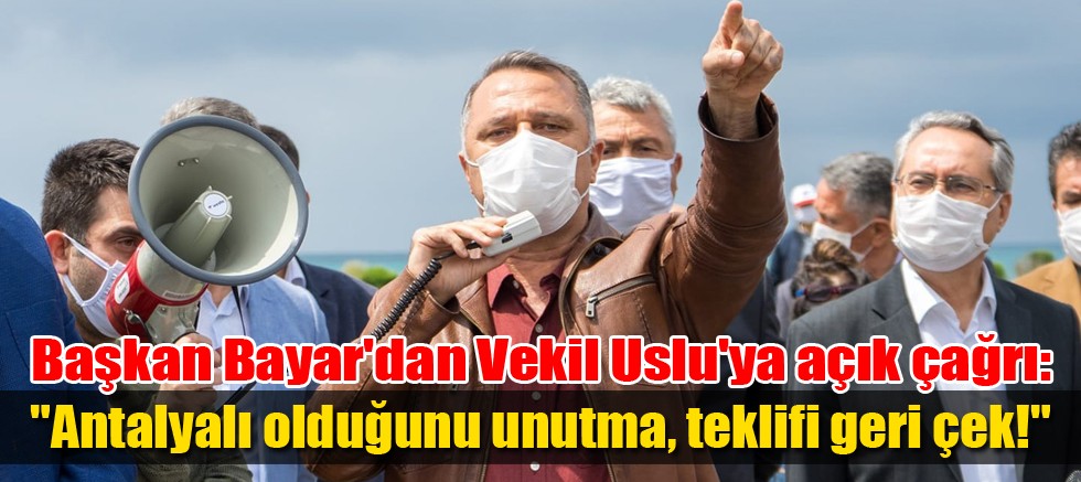 Cumhuriyet Halk Partisi Antalya İl Başkanı Nusret Bayar, AKP’li Antalya milletvekili Atay Uslu’ya, halka ait alanların satışına zemin hazırlayan meclise sunduğu Turizmi Teşvik Kanunu’ndaki değişiklik teklifinden dolayı sert eleştirlerde bulundu. Başkan Bayar, “Bu ihaneti Antalya unutmaz. Sen de Antalyalı olduğunu unutma, teklifi geri çek!” çağrısı yaptı.