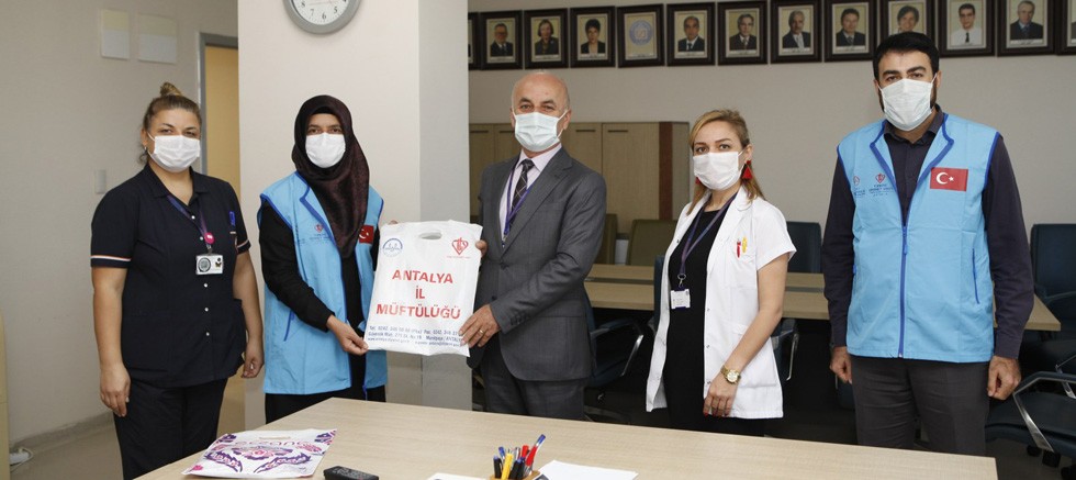 Türkiye Diyanet Vakfı Antalya Şubesi Kadın Kolları Başkanı Aysel Uygun ve Türkiye Diyanet Vakfı Antalya Şubesi personeli İbrahim Yılmaz tarafından Akdeniz Üniversitesi Hastanesi’nde tedavi gören çocuklara dağıtılmak üzere getirilen pijama takımları Akdeniz Üniversitesi Hastane Başmüdürü Şeref Dilekçi’ye teslim edildi.