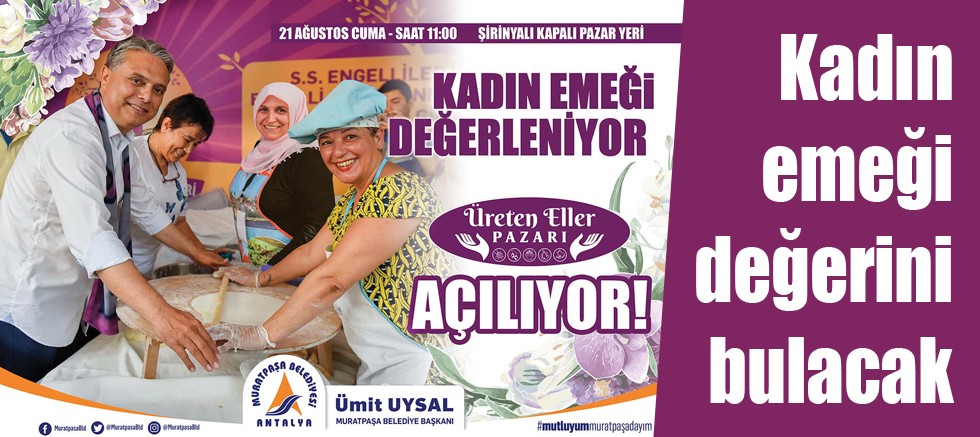 Antalya’da Muratpaşa Belediyesi, kadınların ürettikleri el emeği göz nuru ürünleri doğrudan tüketiciyle buluşmasını sağlayacak ‘Üreten Eller Pazarı’ Şirinyalı Kapalı Pazar Yeri’nde açılıyor. Her Cuma günü 09.00 – 20.00 saatleri arasında kurulacak olan ‘Üreten Eller Pazarı’ ilk kez 21 Ağustos saat 11.00’de, Şirinyalı Kapalı Pazar Yeri’nde açılacak.