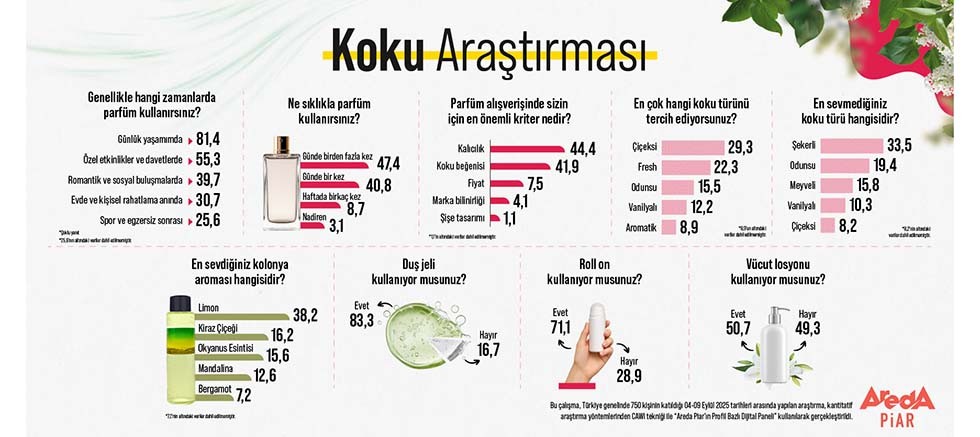 Areda Piar’ın gerçekleştirdiği “Koku Araştırması”, parfümün artık özel günlerin değil, günlük yaşamın bir parçası haline geldiğini ortaya koydu. Katılımcıların %81,4’ü işe, okula ya da alışverişe giderken parfüm kullandığını belirtirken, en çok tercih edilen koku türü “çiçeksi” (%29,3), en az sevilen ise “şekerli” kokular (%33,5) oldu.