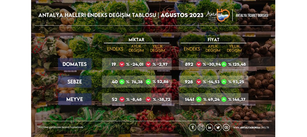 Ağustos ayında miktar endeksleri domates 19, sebze 40 ve meyve ise 52 olarak gerçekleşirken, fiyat endeksleri domateste 892, sebzede 928 ve meyvede 1441 olarak yansıdı.