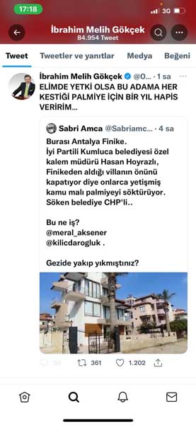 İYİ Parti Kumluca İlçe Başkanı Bekir Bircan, Finike Belediyesi’ne ait palmiye fideliğinden sökülen palmiye ağaçlarıyla ilgili İYİ Parti Meclis üyesi Hasan Hoyrazlı hakkında suçlayıcı ifadeler kullanan Ankara’nın eski AKP’li Belediye Başkanı Melih Gökçek’i yalancılıkla suçladı. Gökçek’in twitter hesabından yaptığı paylaşımda, İYİ Parti Meclis üyesi Hasan Hoyrazlı’nın ‘Finike’den aldığı villanın önünü kapatıyor’ diye onlarca palmiyeyi söktürdüğünü iddia ettiğini hatırlatan Bircan, konunun tamamen çarptırıldığını ileri sürdü.