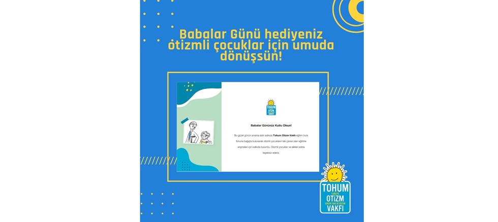 2003 yılından bu yana otizm spektrum bozukluğu’ olan çocukların erken tanısının konulması, özel eğitimi ile topluma kazandırılmasına öncülük edilmesi ve bunun yurt çapında yaygınlaştırılması amacıyla çalışmalarını sürdüren Tohum Otizm Vakfı, Babalar Günü’nde herkesi Babalar Günü bağış sertifikalarından alarak otizmli çocukların eğitim burs fonuna destek olmaya çağırıyor.