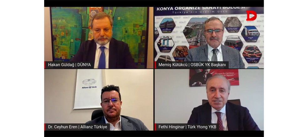 Dünya Gazetesi Yönetim Kurulu Başkanı Hakan Güldağ’ın moderatörlüğünü üstlendiği “Sanayide Dönüşüm, Yeşil OSB Konsepti ve Yapısal Dönüşüm” konulu webinara Organize Sanayi Bölgeleri Üst Kuruluşu (OSBÜK) Yönetim Kurulu Başkanı Memiş Kütükcü, Türk Ytong Yönetim Kurulu Başkanı Fethi Hinginar ve Allianz Türkiye Risk Mühendisliği ve Allianz Teknik Direktörü Dr. Ceyhun Eren katıldı.