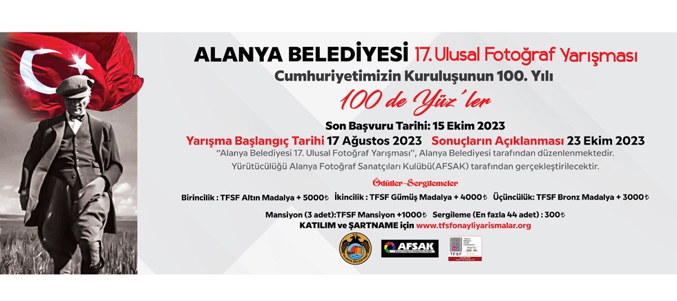 Alanya Belediyesi 17. Ulusal Fotoğraf Yarışması, AFSAK ve TFSF işbirliğiyle Cumhuriyetin 100. yılına özel “100’de Yüz’ler” konsepti ile düzenleniyor. Son başvuru tarihi 15 Ekim olarak belirlenen yarışmanın sonuçları 23 Ekim’de açıklanacak.