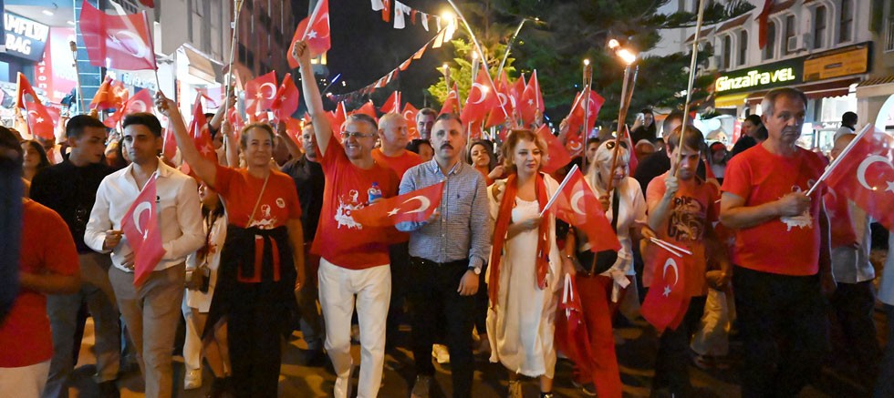 Ellerinde Türk bayrakları ve meşaleler taşıyan kortej, Liman Caddesi'nden geçerek, Kemer Belediyesi önüne geldi.