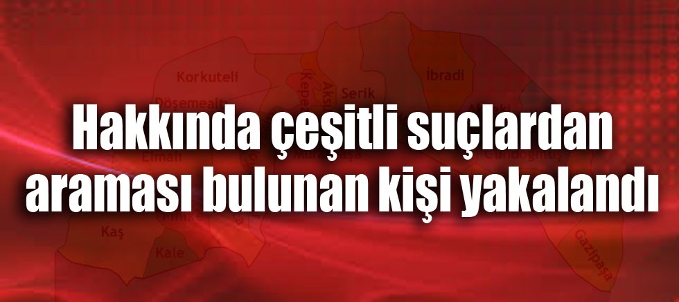 "Antalya Cumhuriyet Başsavcılığı koordinesinde; Antalya ili, Döşemealtı İlçesi,Camili Mahallesinde Antalya İl Jandarma Komutanlığı Asayiş Şube Müdürlüğü JASAT timleri ve Döşemealtı İlçe Jandarma Komutanlığı ekipleri tarafından nitelikli suçlardan uzun süredir aranan şahısların yakalanması maksadı yürütülen faaliyet kapsamında; hakkında 6136 SKM, Resmi Belgede Sahtecilik, Nitelikli Dolandırıcılık, Sahte Banka veya Kredi Kartı Kullanma, gibi çeşitli suçlardan (29) adet suç kaydı bulunan ve halen Sahte Banka veya Kredi Kartı Kullanmak suretiyle Yarar Sağlama Suçundan aranan ve kesinleşmiş (15) yıl (2 ) Ay (14) gün hapis cezası bulunan S. N isimli şahıs 01.04.2022 tarihinde düzenlenen operasyonda yakalanmıştır.