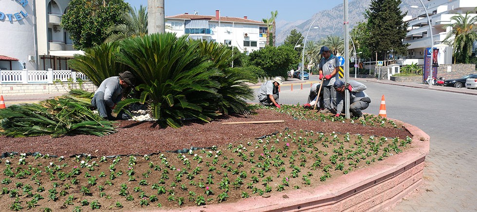 Kemer Belediyesi Park ve Bahçeler Müdürlüğü ekipleri, ilçe genelindeki kavşaklarda bakım çalışmaları yaparak mevsimlik çiçek ekimi gerçekleştiriyor.