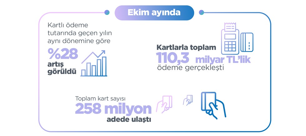 Bankalararası Kart Merkezi bu yılın ekim ayı verilerini açıkladı. BKM'nin verilerine göre, ekim ayında kartlı ödeme tutarı geçen yılın aynı dönemine kıyasla yüzde 28 oranında büyüme gösterdi. Söz konusu dönemde internetten kartlı ödeme tutarı yüzde 52 artarken, temassız ödemeler ise 4 katına çıkarak 210 milyona ulaştı.