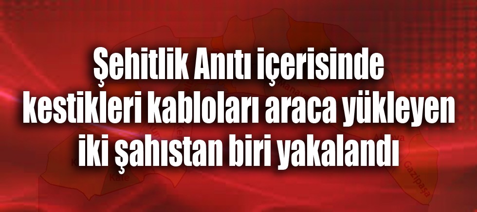 "Manavgat Cumhuriyet Başsavcılığı koordinesinde; Antalya ili, Manavgat ilçesi, Evrenseki Mahallesinde 29.03.2022 günü saat: 21:00 sıralarında icra edilen devriye faaliyeti esnasında Manavgat Belediyesine ait Şehitlik Anıtı içerisinde iki şüpheli şahsın aydınlatma direklerine giden kabloları keserek 07 A.. 6.. plakalı araca yüklemeye çalıştıkları tespit edilmesi üzerine şüpheli  C.D. isimli şahıs yakalanmıştır.