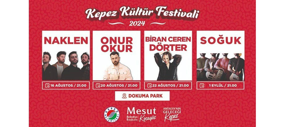 Kepez Belediyesi'nin düzenlediği Kültür Festivali, NAKLEN grubu, Onur Okur, Biran Ceren Dörter ve SOĞUK Grubu’nun konserleriyle renklenecek. Dokuma Park’ta farklı günlerde gerçekleşecek konserlerde sanatçılar, Antalyalıları müzik şöleniyle buluşturacak.
