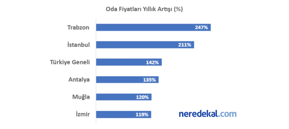 Neredekal.com’un hazırladığı rapor otel odalarındaki fiyat değişimini ortaya koyuyor. Neredekal.com platformunda yer alan 23 bin tesis arasından, 2021 ve 2022 Eylül ayı aynı döneminde fiyat listeleyen 6 bin tesisin aynı tip odaları baz alınarak yapılan analiz oda fiyatlarının önceki yıla göre %142 arttığını gösteriyor. 1 yıl içerisinde araştırmaya konu olan tesislerin ortalama oda fiyatı 555TL'den 1.341TL'ye yükseldi. İller bazında inceleme yapıldığında, 100 ve üzeri tesise sahip şehirlerde oda fiyatı en çok artan iller sırasıyla Trabzon, İstanbul, Antalya, Muğla ve İzmir oldu. Bu artıştan en az etkilenen yaz tatili turizmiyle öne çıkan ilimiz ise Mersin. Bahar aylarındaki doğasıyla yerli turistleri kendine çeken Bolu ve Kastamonu illeri de Mersin’den sonra oda fiyatları en az yükselen illerimiz oldu.