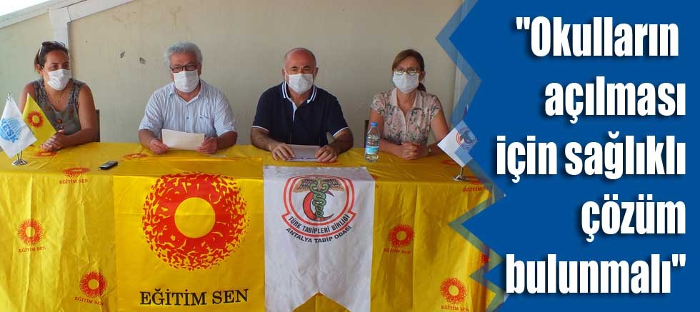 Eğitim-Sen ve Antalya Tabip Odası, okulların açılması kararı ile ilgili olarak bir basın açıklaması yaptı. Antalya Tabip Odası adına Dr. Naci İşoğlu ve Dr. Aydan İzgi'nin katıldığı basın açıklamasında şöyle denildi: