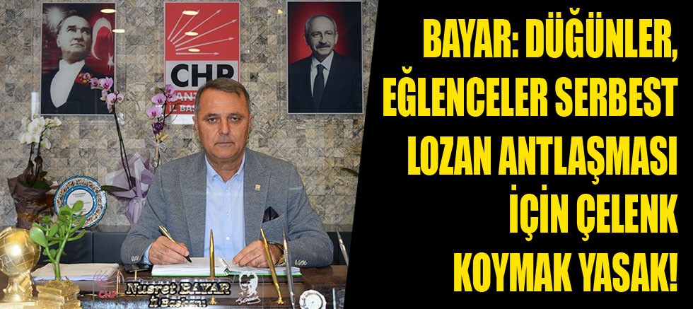 Cumhuriyet Halk Partisi Antalya İl Başkanı Nusret Bayar, Lozan Barış Antlaşması’nın 97. Yıldönümü için CHP Antalya İl Başkanlığı olarak Cumhuriyet Meydanı’na çelenk bırakmak istediklerini ancak Antalya Valiliği kararıyla bu törene izin verilmediğini ifade eden yazılı bir basın açıklamasında bulundu. Düğünlere, eğlencelere izin verilip çelenk törenine izin verilmemesine tepki gösteren Başkan Bayar, “Lozan Barış Antlaşması’nın 97. yıldönümünde bağımsızlığımızın teminatı olan bu antlaşmaya imza atanları anmak için Cumhuriyet Meydanı’na çelenk koymak istedik. Ancak Antalya Valiliği çelenk koyma törenine izin vermedi! Sebep ise pandemi sürecinden dolayı kamu sağlığının korunmasıymış... Pandemi sürecinde bizlerin nasıl sorumlu davrandığını, Cumhuriyet Halk Partili belediyelerin bu sürece nasıl katkı koyduğunu dünya alem biliyor ve takdir ediyor. Sokağa çıkalım bakalım; her taraf insan kaynıyor. Sosyal mesafe ve maske kullanımı hak getire… Düğünlere, eğlencelere yasak getirmeyen anlayış kamu sağlığını koruma adı altında LOZAN BARIŞ ANTLAŞMASI için çelenk koymamıza izin vermiyor! Ülkemizin bağımsızlığının teminatı ve tapusu olan Lozan Barış Antlaşması’yla kimlerin yıldızının barışmadığını çok iyi biliyoruz! Bu kararı sorguluyoruz! Bu kararı şiddetli bir şekilde kınıyoruz!” ifadelerine yer verdi.
