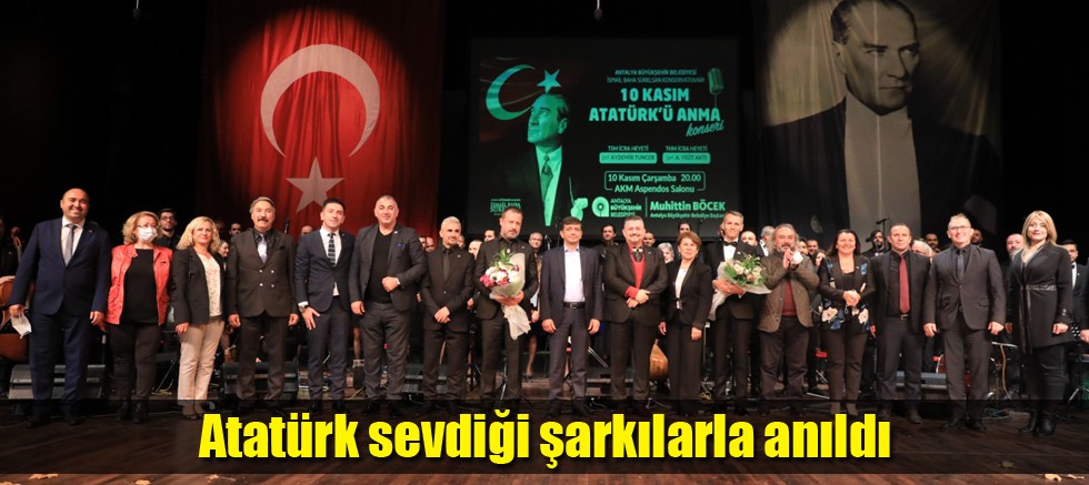Antalya Büyükşehir Belediyesi, İsmail Baha Sürelsan Konservatuvarı TSM ve THM icra heyetleri, 10 Kasım Atatürk'ü Anma Konseri düzenledi. Ulu önder Gazi Mustafa Kemal Atatürk sevdiği şarkılarla ve marşlarla anıldı.