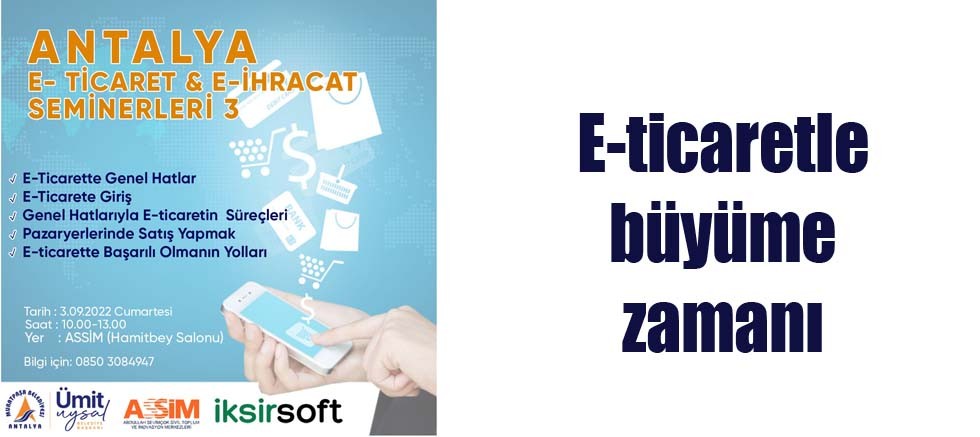 Muratpaşa Belediyesi’nin yenilik, buluş, girişim ve teknoloji destekleme merkezi ASSİM, e-ticaretle yeni pazarlara açılmak, işini büyütmek isteyenler için düzenlendiği seminerlere devam ediyor. Serinin üçüncü semineri 3 Eylül Cumartesi ASSİM’de gerçekleştirilecek.