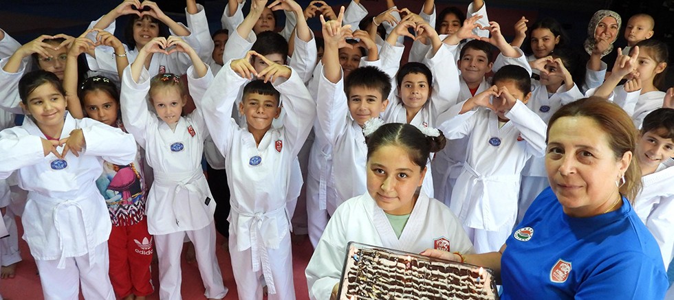 Kepez Belediyesi Spor Kulübü’nün yaz ve kış spor kurslarına katılan öğrenciler, spor disiplini ile tanışmanın yanında en mutlu günlerini birlikte geçirdikleri yeni arkadaşlar da ediniyor. İlk kez tekvando eğitimi alan öğrencilerden Zeynep Beyza Beydilli, 10’uncu yaşını salonda antrenman sonrasında kutladı. Evde yaptığı kutlama pastası ile birlikte Turgut Özal Spor Salonu’na gelen anne Zehra Özdemir, kızının mutluluğunu spor arkadaşları ile paylaşmasını istedi. Yaklaşık 40 kursiyere birer boyama kitabı da hediye eden anne Özdemir, sporcu adaylarını sevindirdi. Ders sonunda yeni öğrencisinin kutlamasına katkı koyan antrenör Derya Uyankaya, ‘Öğrencilerimin tekvando disipliniyle yetişmesi çok önemli. Ama asıl önemli olan iyi bir insan olmaları. Tekvandocularıma her zaman bol kitap okumalarını ve toplumda sağlıklı ilişkiler kurmalarını tavsiye ederim’ dedi.