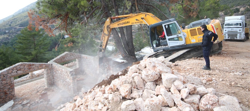 Yıkım işlemine, Kaş Belediyesi zabıta ekipleri ile İmar ve Şehircilik Müdürlüğü ve jandarma yetkilileri katıldı.
