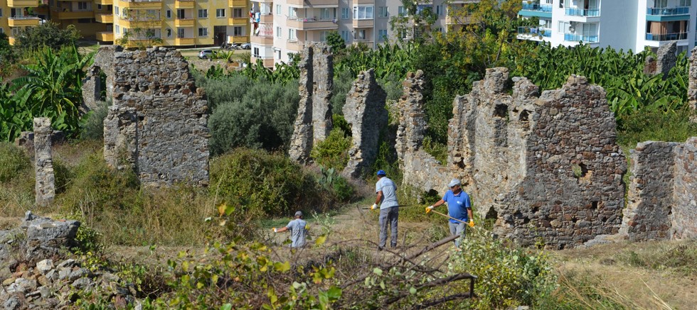 Alanya Müze Müdürlüğü tarafından yürütülen restorasyon çalışmalarının daha rahat yapılabilmesi için antik kent çöp, çalı ve zararlı bitkilerden temizleniyor. Çalışma ile antik kentteki, hem tarihi kalıntılar ortaya çıkmış hem de turistlerin alanı daha rahat gezmeleri temin edilmiş olacak.