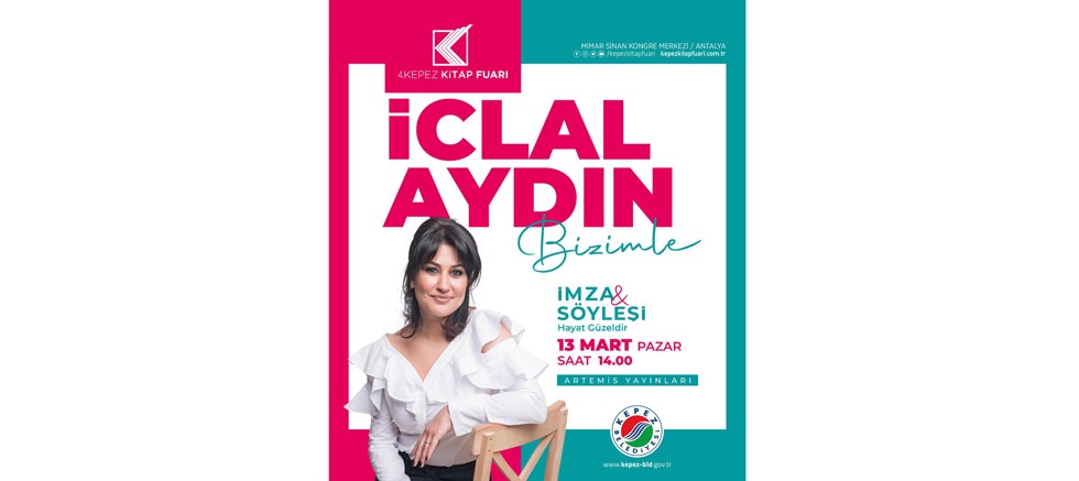 Günümüz Türk Edebiyatının önde gelen yazarlarından oyuncu, yazar, gazeteci ve sunucu İclal Aydın, 4. Kepez Kitap Fuarı’nda düzenlenecek imza gününde sevenleriyle buluşacak.