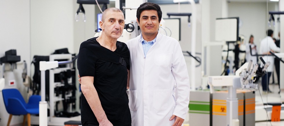 Acıbadem Taksim Hastanesi Fizik Tedavi ve Rehabilitasyon Uzmanı Doç. Dr. Mustafa Çorum da kişiye özel uygulanan ‘robotik rehabilitasyon’ sayesinde Phridon Surmanidze’nin gelişimini şöyle anlatıyor: “Hastamızı ilk gördüğümde sağ kol ve sağ bacağında hiç hareket yoktu. Konuşamıyor, yutma fonksiyonunu gerçekleştiremiyor, oturma dengesi sağlayamıyor ve iki kişinin desteğiyle ayağa kaldırıldığında bu durumu koruyamıyordu. Nefes alması için boynuna delik açılmıştı. Yine ağızdan beslenemediği için bağırsak beslenmesini sağlamak amacıyla PEG (perkütan endoskopik gastronomi işlemi yapılmıştı yani karın duvarından geçirilip esnek bir tüp mideye yerleştirilmişti) açılmıştı ve hasta hareket edemediği, yatağa bağlı olduğu için de sondalı şekilde takip ediliyordu. Çok büyük yatak yaraları vardı. Hastamızın tedavi süreci multidisipliner olarak farklı birkaç branşla başlamıştı ve biz de bir ay sonra hastamızla 19 Temmuz’da Robotik Rehabilitasyon tedavisi uygulamaya başladık. Her gün 4-6 saat süren fizyoterapi seansları, nörorehabilitasyon seansları, ergoterapi uygulamalarıyla robotik rehabilitasyon seansları planladık. Genel sağlık durumuyla birlikte her açıdan çok çarpıcı iyileşme kaydetti ve iki ayda hastamızı yürütmeye başladık.”