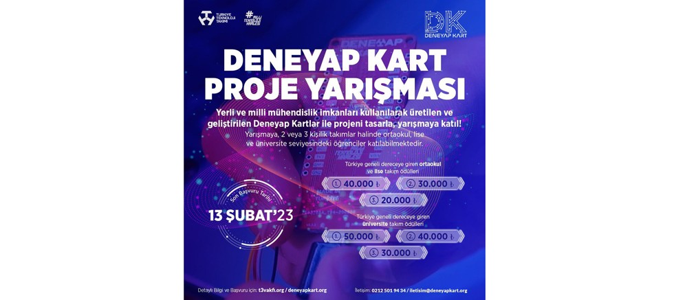 Teknoloji geliştiren bir Türkiye hedefiyle çalışmalarını titizlikle sürdüren Türkiye Teknoloji Takımı Vakfı yeni bir projeyi daha hayata geçirdi. Katma değeri yüksek, yerli ve milli olarak üretilen Deneyap Kart ile “DeneYap Kart Proje Yarışması” düzenleyen T3 Vakfı yetenekli gençleri bir araya getirecek. Düzenlenen yarışmaya gençler sadece Deneyap Kartlarla (Deneyap Kart/Deneyap Kart 1A/Deneyap Kart Mini) geliştirdikleri projelerle katılabilecek. 2-3 kişilik takımlar halinde katılım yapılabilen yarışmanın son başvuru tarihi ise 13 Şubat 2023.
