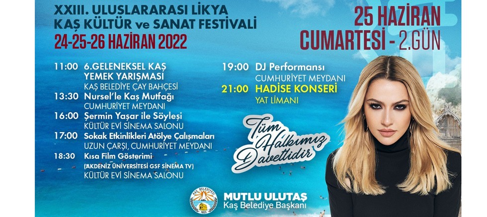 Festivalin ikinci günü, bu yıl 6’ncısı düzenlenen “Geleneksel Kaş Yemek Yarışması” yapılacak. Sokak etkinlikleri ve kısa film gösterimi seyirciyle buluşacak. Aynı gün akşam, konser programında pop müzik şarkıcısı Hadise, Kaş Limanı’nda sahne alacak.