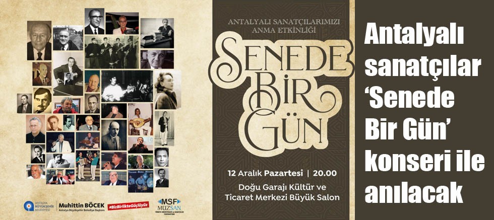 Antalya Büyükşehir Belediyesi Kültür ve Sosyal İşler Dairesi Başkanlığı, anlamlı bir etkinliğe ev sahipliği yapacak. 12 Aralık Pazartesi saat 20.00’da Doğu Garajı Kültür Merkezi Büyük Salonda, Emin Altıner Yönetmenliğinde ‘Senede bir gün’ konseri gerçekleştirilecek. Konserde Antalya’nın hafızalarına kazınmış unutulmayan sanatçılar anılacak.