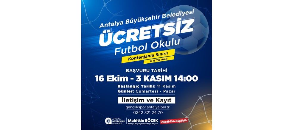 Antalya Büyükşehir Belediyesi Gençlik ve Spor Hizmetleri Dairesi Başkanlığı tarafından gerçekleştirilecek ücretsiz Futbol Okulu başvurularının ardından kursa kayıt yaptırmaya hak kazanan öğrenciler 11 Kasım Cumartesi günü eğitime başlayacak. Futbol okulu, hafta sonları Cumartesi ve Pazar günleri düzenlenecek.