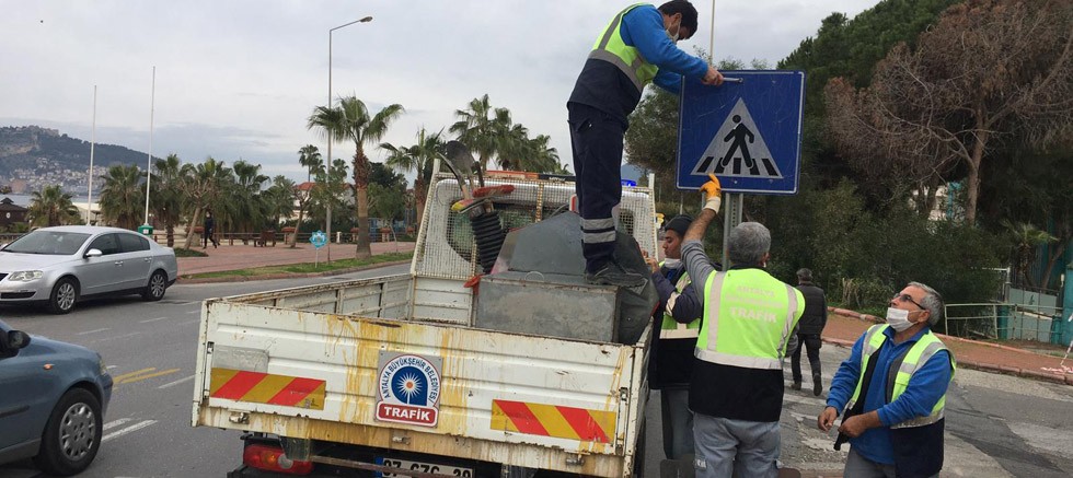 Antalya Büyükşehir Belediyesi, Trafik Şube Müdürlüğü Alanya sinyalizasyon ve levha ekipleri, şehir merkezinin yanı sıra kırsal mahallelerde de vatandaşların güvenli bir şekilde ulaşım yapabilmesi için gerekli alt yapı çalışmalarını sürdürüyor. Alanya merkezde başta okul çevreleri olmak üzere, şehir genelindeki sinyalizasyonları yenileyen ekipler, trafik işaret ve levhalarına da bakım onarım çalışması yapıyor. Levha bulunmayan ya da yıpranmış levha olan noktalara da yenileri monte ediliyor.