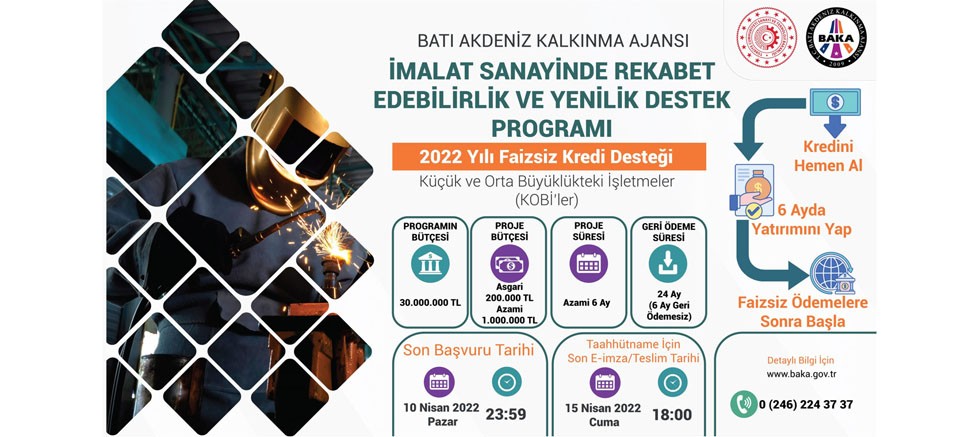Batı Akdeniz Kalkınma Ajansı (BAKA), Antalya, Isparta ve Burdur’daki ‘Mikro, Küçük ve Orta Büyüklükteki İşletmeler’e (KOBİ) yönelik Faizsiz Kredi Desteği kapsamında ‘İmalat Sanayinde Rekabet Edebilirlik ve Yenilik Destek Programı’nı başlattı. KOBİ’lere 200 bin TL ile 1 milyon TL arasında faizsiz kredi desteği sağlanacak program için ayrılan toplam bütçe 30 milyon TL ve son başvuru tarihi 10 Nisan 2022 olarak belirlendi. Proje süresi azami 6 ay olarak belirlenen programdan destek almaya hak kazanan proje sahipleri, 6 ayı geri ödemesiz 24 ayda faizsiz olarak kredilerini geri ödeyebilecek.