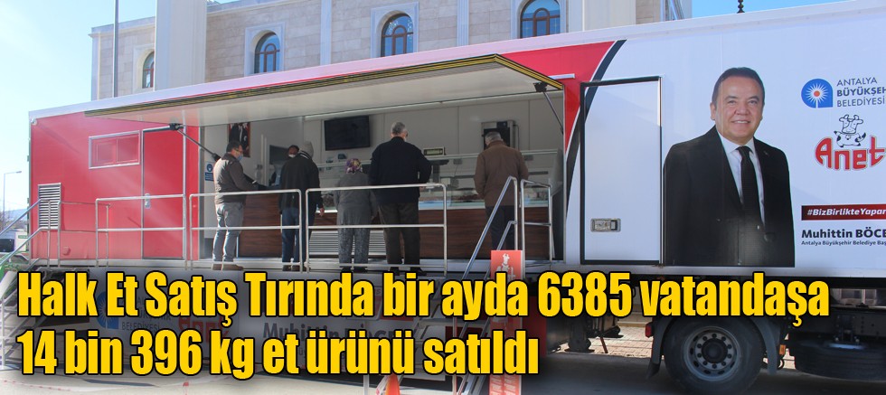 Antalya Büyükşehir Belediye Başkanı Muhittin Böcek’in talimatıyla ekonomik ve sağlıklı et ürünlerini Antalyalılarla buluşturmak üzere yola çıkan ANET Mobil Halk Et Satış Mağazası bir aydır batı ilçelerini geziyor. Halk Et Mobil Satış Mağazası’nda 11 Ocak’tan bu yana 6835 vatandaşa 14 bin 396 kg et ve et ürünü satışı gerçekleştirildi.