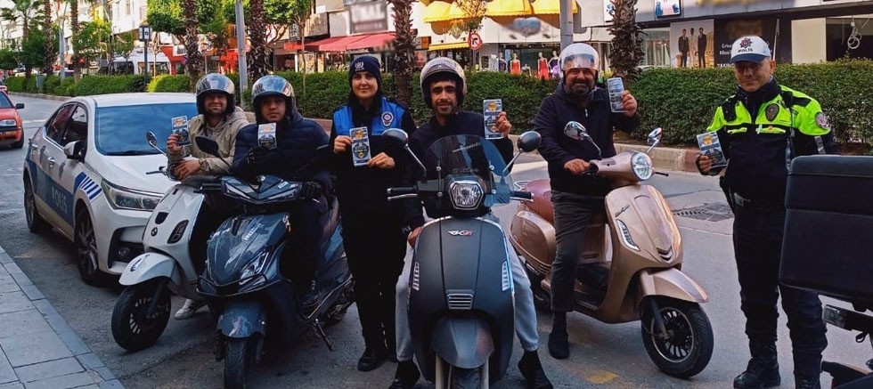 Manavgat İlçe Emniyet Müdürlüğü birimlerince motosiklet kullanan vatandaşlara kask kullanmanın önemi anlatıldı.