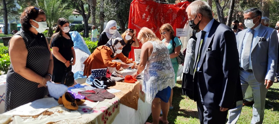 pandemi tedbirleri alınarak açılan sergi alanını gezerek, ev hanımlarının yaptığı ürünleri inceledi ve bilgi aldı.