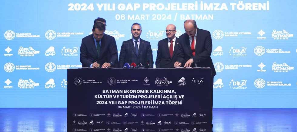 “HAKİKİ BAHARI GETİRDİK” GAP Bölge Kalkınma İdaresi ile 24,7 milyon lira destek sağladıkları ve Batman’ın kalkınma yolculuğuna güç katacak 7 projenin imza törenini gerçekleştirdiklerini kaydeden Kacır, “Hayata geçirdiğimiz projelerle nice medeniyetlere ev sahipliği yapmış, Batman’da, Ezidi ziyaretgahlarının çevresel düzenlemesini gerçekleştirirken, soyut kültürel miras unsurlarını da gelecek kuşaklara aktarıyoruz. Hasankeyf Müze Bahçesi’nin çevre düzenlemelerini gerçekleştirerek müzemizin tam anlamıyla turizme entegre olmasını sağlıyoruz. Dikey tarım uygulamalarında yenilenebilir enerji kullanımını destekliyoruz. Kışlık sebze yetiştiriciliği ve ikinci ürün yetiştirmeyi teşvik ediyoruz. Üreticilerimize sağladığımız tohum ve ekipman desteğiyle hem çiftçimizin gelirinin hem de istihdamın artırılmasına katkı sağlıyoruz. Kadın girişimciliğini güçlendirerek kadınlarımızın ekonomiye katılımını sağlıyoruz. Yıllardır terörle, yokluk ve yoksullukla anılan bölgemize hakiki baharı biz getirdik.” diye konuştu. Yapılan konuşmaların ardından Batman Ekonomik Kalkınma, Kültür ve Turizm Projelerinin açılışı ve 2024 Yılı GAP Projeleri İmza Töreni Sanayi ve Teknoloji Bakanı Mehmet Fatih Kacır ile Hazine ve Maliye Bakanı Mehmet Şimşek’in huzurunda gerçekleştirildi.
