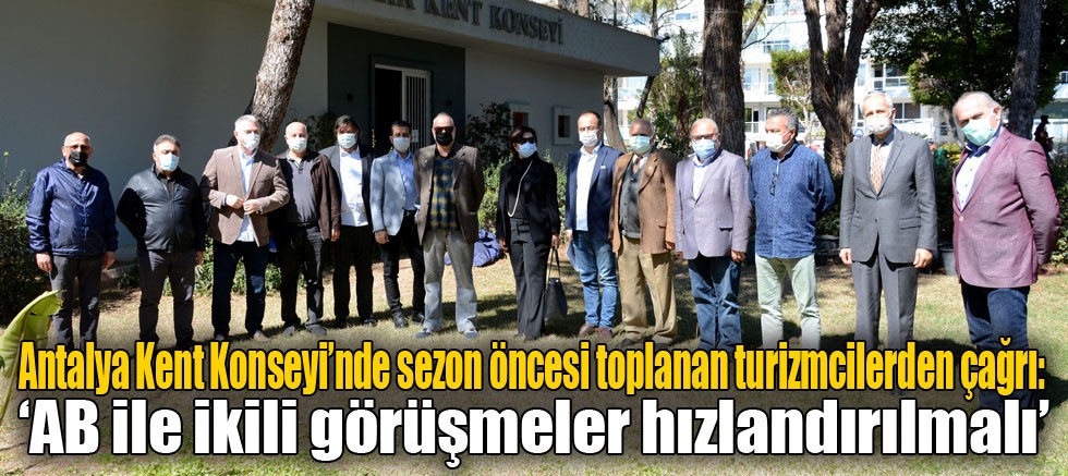 Antalya Kent Konseyi Turizm Çalışma Grubu, turizm sezonu öncesi 2021 sezonuyla ilgili bir toplantı yaptı. Toplantıda Türkiye’nin pandemi sürecinde hamlelerini sürerek talebini yurtdışında daha kuvvetli duyurması gerektiği belirtilerek, “Turizm her ne kadar çabuk ve hızlı reaksiyon alınsa da sadece Rus pazarına endeksli olmamalı. Bu yüzden AB ile ikili görüşmeler bir an önce hızlandırılmalı” denildi.