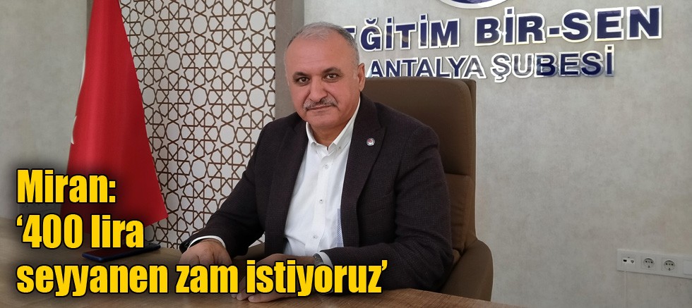 Kamu görevlilerinin maaş artışının yetersiz olduğunu belirten Eğitim Bir Sen Antalya Şube Başkanı Eyüp Bülent Miran, 2021 yılının basından itibaren 400 lira seyyanen zam istediklerini, bu sayede geçmiş kayıpların önleneceğini ve gelecekte enflasyona yenilme riskinin biteceğini kaydetti.