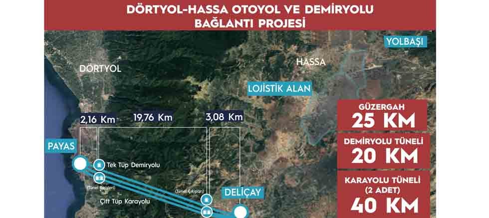 Proje hakkında bilgi veren Uraloğlu, “Dörtyol-Hassa Demir yolu ve Otoyolu Projesi kapsamında 25 kilometrelik güzergahta, 1 adet demir yolu tünelinin uzunluğu 20 kilometre, 2x2 şeritli olacak olan 2 adet otoyol tünelinin uzunluğu ise 40 kilometredir. Proje kapsamında yapılacak olan tünelin 3 farklı tüpten oluşması ve tünel boylarının da 20’şer kilometre olması planlanmıştır. Proje iki etaptan oluşacak olup, tünel yapımını kapsayan ilk etabı Hassa kavşağında sona erecektir.” açıklamasında bulundu.