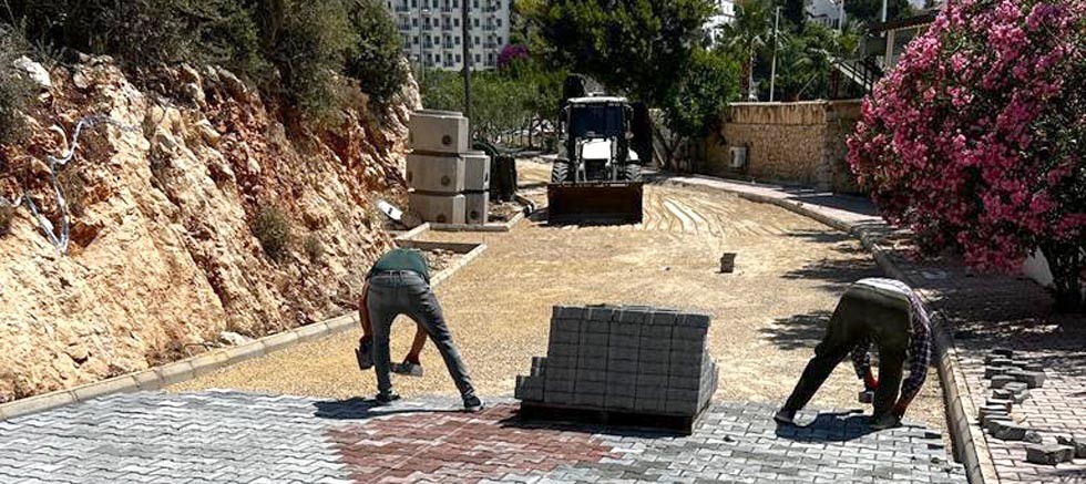 Kaş Belediyesi, kilitli parke taşı döşeme çalışmaları gerçekleştiriyor.