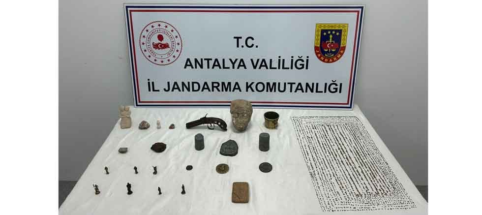Antalya Cumhuriyet Başsavcılığı talimatları doğrultusunda; Antalya İl Jandarma Komutanlığı İsth.Şb.Md.lüğü ve Kepez İlçe Jandarma Komutanlığı ekipleri tarafından yapılan çalışmalar sonucunda Antalya ili Kepez ilçesinde şüpheli bir şahsın elinde bulundurduğu tarihi eserleri satmaya çalıştığının tespit edilmesi üzerine şüphelinin evinde yapılan aramada, Hitit ve Roma dönemlerine ait;